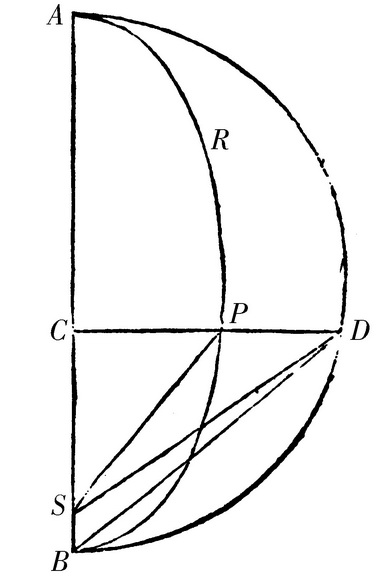 情形1 如果物体不竖直下落,此物体(由命题XIII系理1)画出其焦点与力的中心重合的圆锥截线。设那条圆锥截线为ARPB,其焦点为S。首先,如果图形为一个椭圆;在它的长轴AB上画半圆ADB,又直线DPC经过下落物体垂直于轴;再作DS,PS,面积ASD与面积ASP成比例,且因此亦与时间成比例。保持轴AB持续减小椭圆的宽度,则面积ASD总保持与时间成比例。那个宽度被减小以至无穷:现在轨道APB与轴AB,且焦点S与轴的端点B重合,物体在直线AC上下落,面积ABD变得与时间成比例。且因此空间AC被给定,物体由位置A竖直下落,在给定的时间画出这一空间,只要面积ABD取得与时间成比例,且由点D往直线AB上落下垂线DC。此即所求