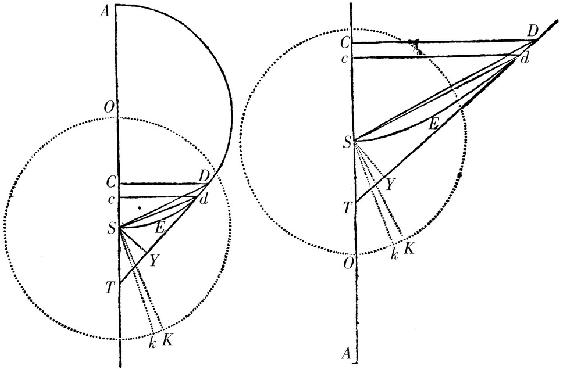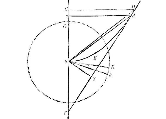 因为设想一个物体C在下落中在极短的时间段画出短线Cc,且在此期间另一个物体K围绕中心S运行,在圆OKk上均匀地画出弧Kk。竖立垂线CD,cd交图形DES于D,d。连结SD,Sd,SK,Sk,并引Dd交轴AS于T,又向它[Dd]落下垂线SY。