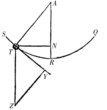 系理1 因此,如果物体T,它悬挂在始自中心A的笔直的细线AT上,画出圆弧STRQ,且在此期间沿向下的平行线它受某个力的推动,这个力比均匀的重力,如同弧TR比它的正弦TN:则每一振动的时间相等。因为,由于TZ,AR平行,三角形ATN,ZTY是相似的;且所以TZ比AT如同TY比TN;这就是,如果均匀的重力由给定的长度AT表示;力TZ,由它振动成为等时的,比重力AT,如同等于TY的弧TR比那个弧的正弦TN。