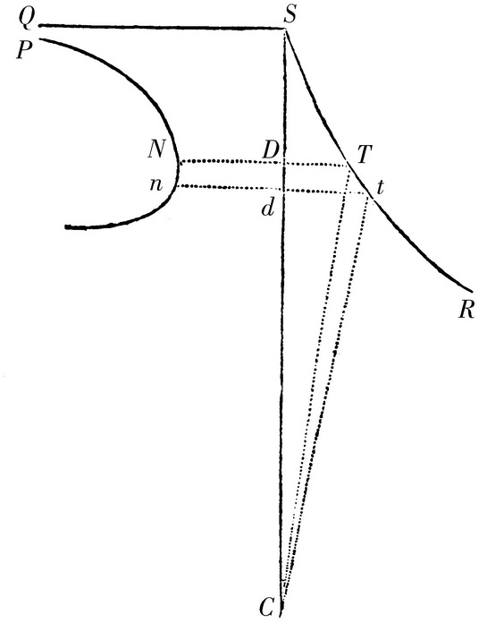 设物体自任意的位置S下落,经过在从力的中心C穿过的一个平面上给定的任意的曲线STtR。连结CS并把它分成无数相等的部分,且设Dd为那些部分中的一个。以C为中心,以间隔CD,Cd画圆DT,dt,交曲线STtR于T和t。既给定向心力的定律,又给定物体从那里落下的高度CS;(由命题XXXIX)物体在其他任意高度CT的速度被给定。然而,时间,在此期间物体画出短线Tt,如同这条短线的长度,亦即,与角tTC的正割成正比,且与速度成反比。设与这段时间成比例的纵标线DN过点D垂直于直线CS,又由于Dd给定,矩形Dd×DN,这就是面积DNnd,与同一时间成比例。所以,如果PNn是点N持续接触的那条曲线,且它的渐近线是垂直立于直线CS上的直线SQ:面积SQPND与物体下落画出[曲]线ST的时间成比例;且所以由那个面积的求得,时间被给定。此即所求。