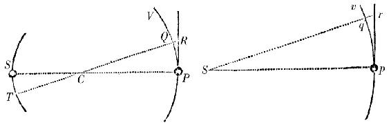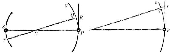 设物体S,P围绕[它们的] 重力的公共的中心C运行,由S向T以及由P向Q前进。由一给定的点s引总与 SP,TQ相等且平行的sp,sq;又曲线pqv,它由点p围绕不动点s旋转画出,与由物体S,P相互围绕画出的曲线相似且相等;且所以(由定理XX)相似于曲线ST和PQV,它们由相同的物体围绕重力的公共的中心C画出;这是因为直线SC,CP与SP或者sp彼此之比被给定。