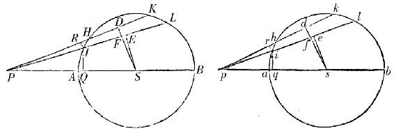设AHKB,ahkb为以S,s为中心,AB,ab为直径画出的两个相等的球面,且位于球外的小物体P,p在那些直径的延长上。由小物体引直线PHK,PIL,phk,pil,从最大圆AHB,ahb截下相等的弧HK,hk和IL,il;又往它们落下垂线SD,sd;SE,se;IR,ir;其中SD,sd截PL,pl于F和f。再往直径上落下垂线IQ,iq。设角DPE和dpe消失,又由于DS和ds,ES和es相等,直线PE,PF和pe,pf以及短线DF,df可认为是相等的;因为它们的最终比,当那些角DPE,dpe同时消失时,是等量之比。这些既已确定,则PI比PF如同RI比DF,且pf比pi如同df或者DF比ri;又由错比,PI×pf比PF×pi如同RI比ri,这就是(由引理VII系理3)如同弧IH比弧ih。再者,PI比PS如同IQ比SE,且ps比pi如同se或者SE比iq;又由错比,PI×ps比PS×pi如同IQ比iq。由比的联合,PIquad.×pf×ps比piquad.×PF×PS如同IH×IQ比ih×iq;这就是,如同圆形面,它由弧IH当半圆AKB围绕直径AB转动时画出,比一个圆形面,它由弧ih当半圆akb围绕直径ab转动时画出。且力,由它们这些面沿直线向着自己牵引小物体P和p,与(由假设)这些面成正比,且与面离物体的距离的平方成反比,这就是,如同pf×ps比PF×PS。又,这些力比它们的倾斜部分,即那些(由诸定律的系理2,力被分解)沿直线PS,ps趋向中心的力,如同PI比PQ,和pi比pq;亦即,(由于三角形PIQ和PSF,piq和psf相似)如同PS比PF和ps比pf。因此,由错比,这个小物体P向着S的吸引比小物体p向着s的吸引,如同(PF×pf×ps)/(PS)比(pf×PF×PS)/(ps),这就是,如同psquad.比PSquad.。且由类似的论证,力,由它们弧KL,kl转动所画出的面牵引小物体,如同psquad.比PSquad.,且两个球面通过总是取sd等于SD和se等于SE能被划分为圆形面,所有圆形面的力按照相同的比。又由合比,整个球面施加在小物体上的力,按照相同的比。此即所证