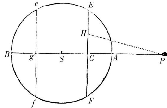 情形1 设AEBF为一个球,S为它的中心;P为被吸引的小物体;球的轴PASB穿过小物体的中心;两个平面EF,ef截球面并垂直于这个轴,且一个平面在一侧,另一个平面在另一侧,离球的中心的距离相等;G,g是平面和轴的公共部分;又H是平面EF上的任意一点。点H的沿直线PH施加于小物体P上向心力,如同距离PH;且它的(由诸定律的系理II)沿直线PG,或者向着中心S[的向心力],如同长度PG。所以在平面EF的所有点的力,这就是整个平面的力,由它小物体被向着中心S吸引,如同距离PG乘以点的数目,亦即,如同包含于那个平面EF自身和那个距离PG之下的立体。且类似地,平面ef的力,由它小物体P被向着中心S吸引,如同那个平面乘以它自己的距离Pg,或者如同与此相等的平面EF乘以那个距离Pg;则那两个平面的力之和如同平面EF乘以距离之和PG+Pg,亦即,如同那个平面乘以二倍的中心和小物体的距离PS,这就是,如同二倍的平面EF乘以距离PS,或者如同相等的平面之和EF+ef乘以同一距离。由类似的论证,在整个球中所有平面的力,在离球的中心距离相等的两侧,如同平面之和乘以距离PS,这就是,如同整个球和距离PS的联合。此即所证