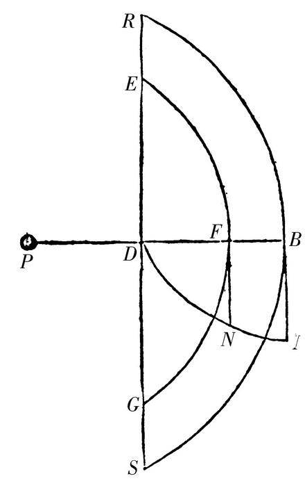 设物体P在球的中心,且它的球截形RBSD由平面RDS和球面RBS围成。以中心P画出的球面EFG截DB于F,球截形被分为部分BREFGS,FEDG。但是那些球面不是纯数学的,而是物理的,有极小的厚度。称那个厚度为O,则这些面(由阿基米德的证明)如同PF×DF×O。此外,我们设球的小部分的吸引力与距离的那个幂成反比,其指数为n;且力,由它面EFG牵引物体P,(由命题LXXIX)如同(DEq×O)/(PFn),亦即如同(2DF×O)/(PFn-1)-(DFq×O)/(PFn)。垂线FN乘以O与此量成比例;则曲线BDI的面积,纵标线FN在长度DB上以连续运动画出曲线,如同整个力,由它整个球截形RBSD牵引物体P。此即所求