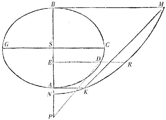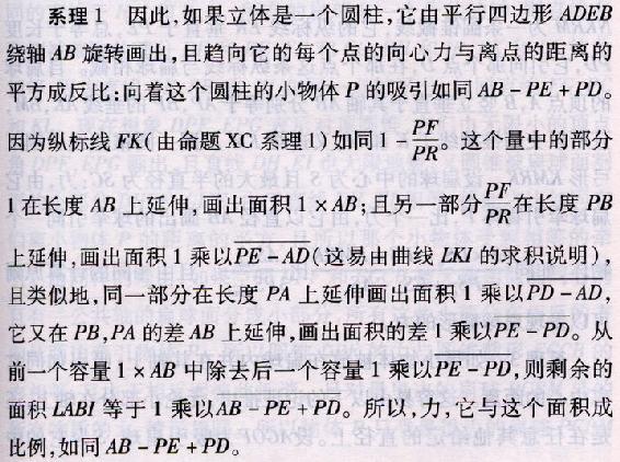 系理2 因此,也能知道一个力,由它一个扁球(sphærois)AG BC牵引任意的物体P,物体位于扁球外且在它的轴AB上。设NKRM为一条圆锥截线,它的纵标线ER垂直于PE,总等于长度PD,它引向那个点D,在那个点这条纵标线与扁球相截。自扁球的顶点A,B竖立垂直于其轴AB分别等于AP,BP的垂线AK,BM,且所以交圆锥截线于K和M;又连结KM从同一圆锥截线中割下弓形KMRK。设扁球的中心为S且最大的半直径为SC:力,由它扁球牵引物体P,比一个力,由它以直径AB画出的球牵引同一个物体,如同(AS×CSq-PS×KMRK)/(PSq+CSq-ASq)比(AScub.)/(3PSquad.)。且由相同的计算原则可以发现扁球截形的力。
