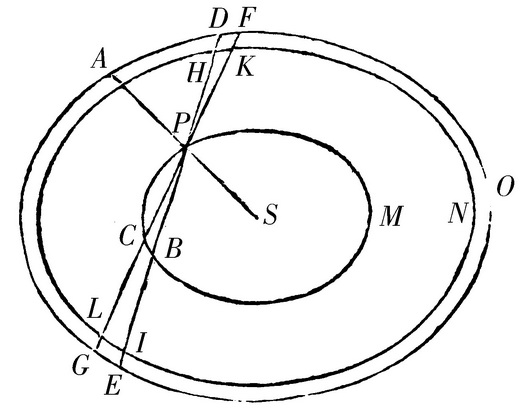 系理3 如果小物体被放在扁球内并在其轴上;吸引如同它离中心的距离。这容易由以下的论证推出,无论小部分在轴上,还是在任意其他给定的直径上。设AGOF为吸引扁球,S为它的中心,且P为被吸引物体。经那个物体P既引半直径SPA,又引两条任意直线DE,FG交扁球的这一侧于D,F,那一侧于E和G;且设PCM,HLN为两个内扁球面,与外扁球面相似且同心,前一个扁球面穿过物体P,且截直线DE和FG于B和C,后一个扁球面截相同的直线于H,I和K,L。所有的扁球有一个公共的轴,则直线在两侧被截取的部分DP和BE,FP和CG,DH和IE,FK和LG彼此相等;因为直线DE,PB,和HI在同一点被平分,如同直线FG,PC和KL。现在想象DPF,EPG表示对顶圆锥,它们由无限小的顶点角DPF,EPG画出,且直线DH,EI也无限地短;又圆锥被扁球面割下的小部分DHKF,GLIE,由于直线DH,EI相等,彼此之比如同它们离小物体P的距离的平方,且所以那个小物体受到相等的牵引。由同样的理由,如果空间DPF和EGCB被无数相似的同心的且有一公共轴的扁球面分成小部分,所有这些小部分在相反的方向从两边牵引物体P。所以圆锥DPF的力与圆锥截形EGCB的力相等,且由于相反而彼此抵消。且对最里边的扁球PCBM外的所有物质的力,情形相同。所以物体P只受最里边的扁球PCBM的牵引,且因此(由命题LXXII系理3)它的吸引比一个力,由这个力物体A被整个扁球AGOD吸引,如同距离PS比距离AS。此即所证