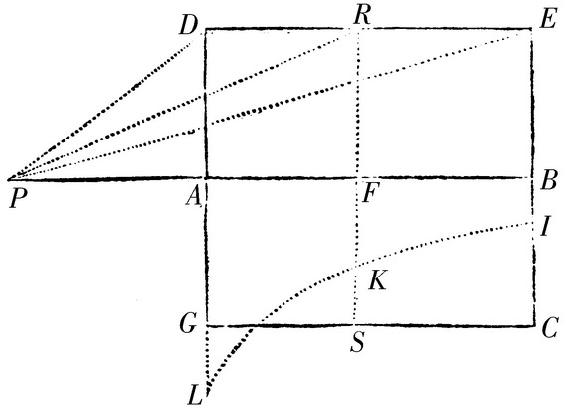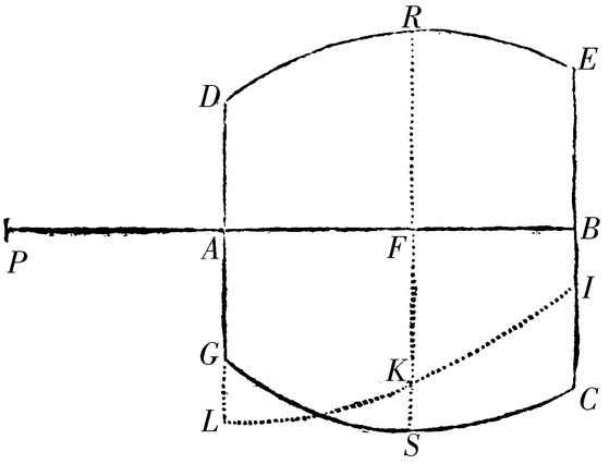 设小物体P被向着立体DECG牵引,小物体位于立体的轴AB上。垂直于这个轴的任意圆RFS与这个立体相截,且在它的半直径FS上,它在某个穿过轴的平面PALKB内,取(由命题XC)长度FK,它与小物体P被吸向那个圆的力成比例。点K接触的曲线LKI交最外面的圆的平面AL和BI于L和I;则小物体P向着立体的吸引如同面积LABI。此即所求