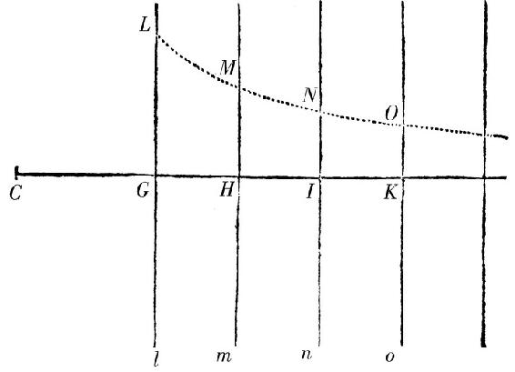 情形1 设LGl为一个平面,立体终止于它。立体位于这个平面向着I的一侧,且被无数与GL平行的平面mHM,nIN,oKO等等分解。首先设被吸引物体C安放在立体之外。引CGHI垂直于那些无数的平面,且立体的点的吸引力按照距离的一个幂下降,它的指数为不小于三的数n。所以(由命题XC系理3)力,由它任意平面mHM牵引点C,与CHn-2成反比。在平面mHM上取长度HM与CHn-2成反比例,则那个力如同HM。类似地,在每个平面lGL,nIN,oKO等等上,取长度GL,IN,KO等等,与CGn-2,CIn-2,CKn-2等等成反比例,则那些平面的力如同所取的长度,且因此力的和如同长度的和,这就是,整个立体的力如同向着OK无限延长的面积GLOK。但是那个面积(由熟知的求积法)与CGn-3成反比,且所以整个立体的力与CGn-3成反比。此即所证