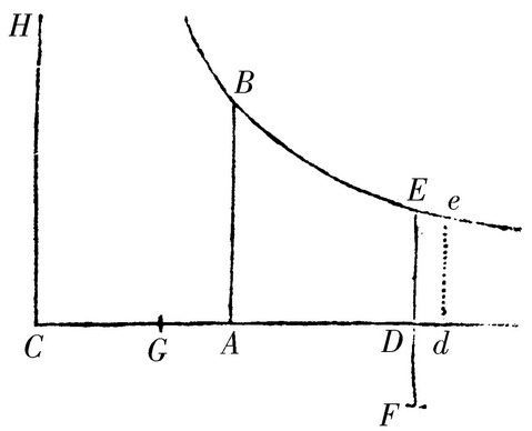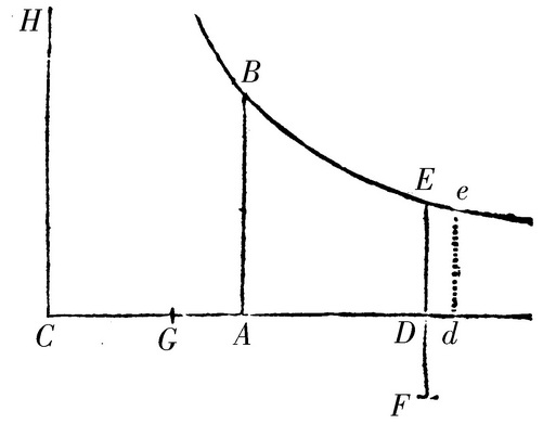 以中心C,直角渐近线CADd和CH画双曲线BEe,且AB,DE,de平行于渐近线CH。在渐近线CD上点A,G被给定。且如果时间用均匀地增加的双曲线的面积ABED表示;我说,速度能用长度DF表示,它的倒数GD与给定的CG一起构成按几何级数增长的长度CD。