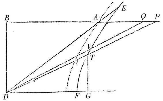 情形2 如果速度在物体上升中用长度AP表示,如同上面,且阻力被假设为如同APq+2BAP,且如果重力小于能由DAq表示的,取BD,它的长度使得ABq-BDq与重力成比例,又DF垂直且等于DB,且过顶点F画双曲线FTVE,它的共轭半直径为DB和DF,且它截DA于E,又截DP,DQ于T和V;则上升的总时间如同双曲线扇形TDE。