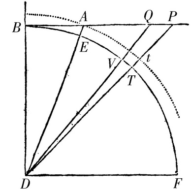 因为引DVQ,割下速度AP的瞬PQ,和扇形DET的瞬DTV,它对应于时间的一个给定的瞬;又速度的那个减量PQ如同重力DAq以及阻力APq+2BAP的和,亦即(由《几何原本》卷2命题12)如同DPquad.。所以面积DPQ,它与PQ成比例,如同DPquad.,且面积DTV,它比面积DPQ如同DTq比DPq,如同给定的DTq。所以通过减去给定的小部分DTV,面积随着将来的时间的瞬均匀地减小,且所以与上升的整个时间成比例。此即所证