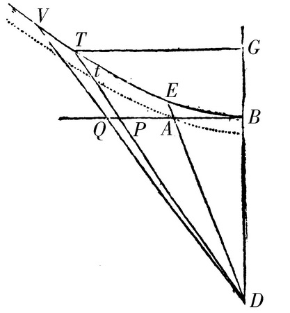 由于速度的增量PQ,且与它成比例面积的DPQ,如同重力对阻力的超出,亦即,如同BDq-ABq-2BAP-APq或者BDq-BPq。又面积DTV比面积DPQ如同DTq比DPq,且因此如同GTq或者GDq-BDq比BPq,又如同GDq比BDq,再由分比,如同BDq比BDq-BPq。所以,由于面积DPQ如同BDq-BPq,面积DTV将如同给定的BDq。所以在每一相等的时间的小部分,由加上数目相同的给定的小部分DTV,面积DET均匀地增加,且所以与下落的时间成比例。此即所证