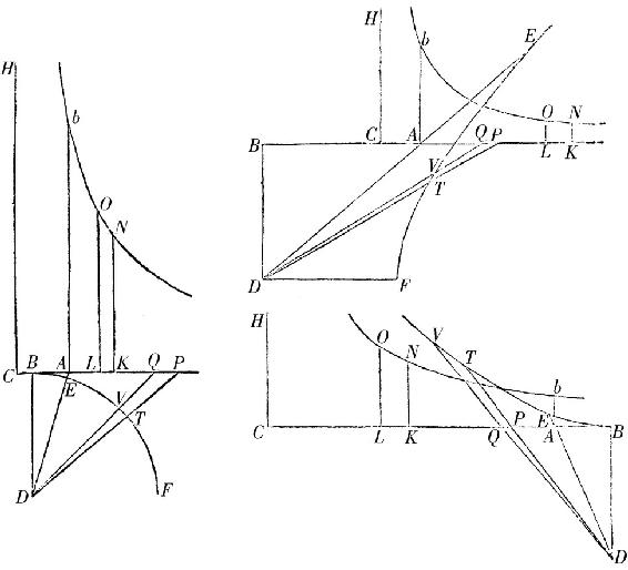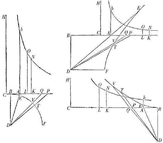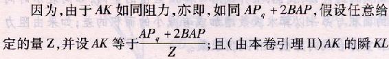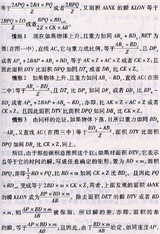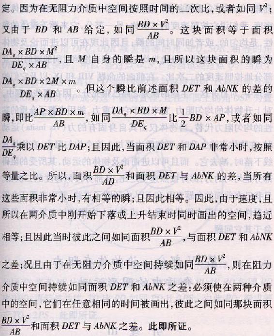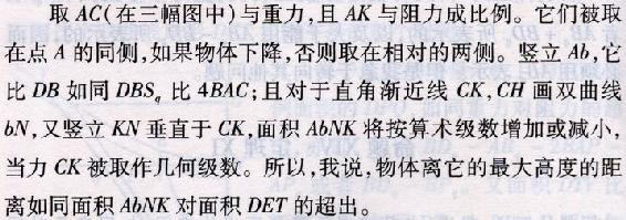 对同样的假设,我说,上升或者下降所画出的空间,如同表示时间的面积与另一以算术级数增加或者减小的面积的差;如果由阻力和重力合成的力被取作几何级数。