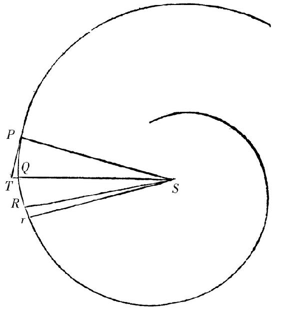 设那条螺线为PQR。从速度,以它物体跑过极短的弧PQ,时间被给定,又从高度TQ,它如同向心力和时间的平方,力被给定。然后从在相等的时间的小部分完成的面积PSQ和QSR的差RSr,物体的迟滞被给定,再从迟滞发现阻力和介质的密度。