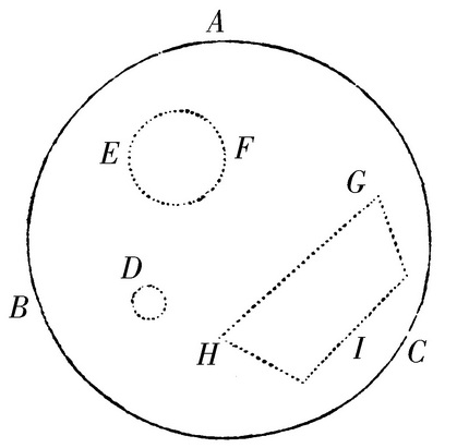 情形1 设流体被封闭在球形容器ABC中且在各个方向上受到均匀的压缩:我说,没有流体的部分由于那个压力(pressio)而运动。因为,如果某个部分D运动,所有在各个方向上位于离中心相同距离的所有此类部分必须同时做类似的运动;事情如此是因为它们的压力全部相似且相等,且每一运动假定被排除,除非来源于那个压力的运动。但流体的部分不能都靠近中心,除非流体在中心被浓缩,这与假设矛盾。它们不能退离它,除非流体在边界被浓缩,这亦与假设矛盾。它们不能保持离中心的距离在一个方向上运动,因为由同样的理由它们沿相反方向运动;但同一部分不可能同时在两个方向上运动,所以没有流体的部分离开自己的位置运动。此即所证