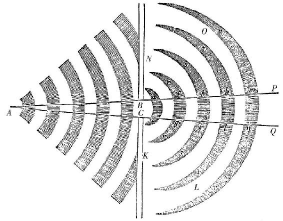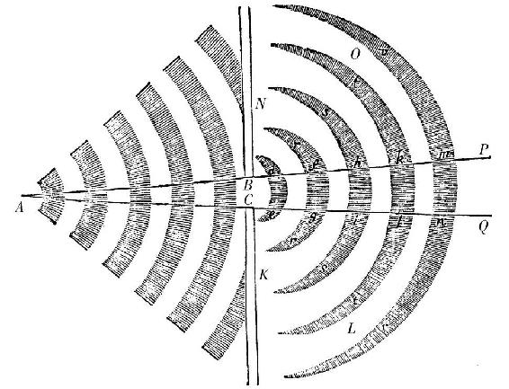 情形2 现在我们假设de,fg,hi,kl,mn指定自点A经弹性介质相继地被传播的冲击。想象冲击由介质的相继紧缩和稀疏传播,使得每次冲击的最致密的部分发生在以A为中心画出的球面上,且相等的间隔介于相继的冲击之间。又指定线de,fg,hi,kl,等等为通过小孔BC传播的冲击的最致密的部分。且由于那里的介质较在一方面朝向KL且另一方面朝向NO的空间的介质更致密,它既向KL,NO两者位于的空间扩展,又向冲击之间的稀疏的间隔扩展;且因此介质,总在紧接着间隔变得更稀疏,且在紧接着的冲击变得更致密,介质参与它们的运动。且因为冲击的前进运动起源于致密部分向在它们前面更稀疏的间隔的不断放松;又由于冲击应以差不多相同的速度,一方面向介质的静止的部分KL且另一方面向介质的静止的部分NO放松;那些冲击向各个方向以差不多与它们从中心A直接传播相同的速度,在不动的空间KL,NO中扩展;且因此整个空间KLON被占据。此即所证。我们对声音有此经验,声音无论隔山而被听到,或者在住室中通过一个窗户扩展到住室的各个部分而在各个角落被听到,它不是作为对面墙的反射,而是由窗户直接传播的,就能感觉到的而言。