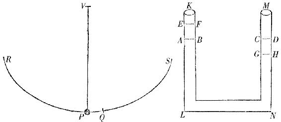 如果水在一根管道的竖直的股KL,MN中交替地上升和下降;而且还建造一架摆,它的悬挂点和振动中心之间的长度等于在管道中水的长度的一半:我说,水上升和下降的时间与摆振动的时间相同。