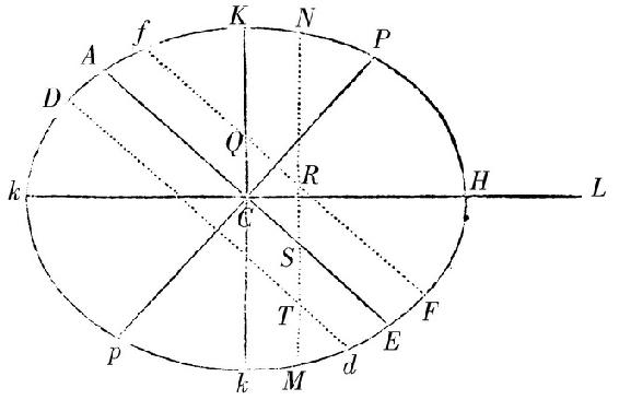 发光体的作用也与位置的纬度有关。指定ApEP为各处被深水覆盖的地球;C为其中心;P,p为极;AE为赤道;F为赤道之外的任一位置,Ff为那个位置的纬线;Dd为在赤道另一侧对应于它的纬线;L为一个位置,它在三个小时之前被月球占据;H为地球上竖直地位于L之下的位置;h这个位置的对点;位置K,k离H,h的距离为90度,CH,Ch为自地球的中心量起的海的最大高度;且CK,Ck为最小高度;再者,如果以轴Hh,Kk画一个椭圆,然后如果这个椭圆再围绕长轴Hh画一扁球HPKhpk;则这个扁球相当接近地表示了海洋的形状,且CF,Cf,CD,Cd为大海在位置F,f,D,d的高度。而且,如果在所说的椭圆的旋转中,任意一点N画出的圆NM截纬线Ff,Dd于任意的位置R,T,且截赤道AE于S;CN为位于这个圆上的所有的位置R,S,T处海的高度。因此,在任意位置F的周日旋转中,最大的涨潮发生在F,在月球经过地平线之上的子午线后的第三个小时;然后,最大的落潮发生在Q,在月球落下之后的第三个小时;此后,最大的涨潮发生在f,在月球经过地平线之下的子午线后的第三个小时;最后,最大的落潮位于Q,在月球升起之后的第三个小时;且靠后在f的涨潮小于在前面在F的涨潮。因为整个海洋被分为两个半球的流,一个是在北边的半球KHk,另一个为相对的半球Khk;所以这些可以被称为北流和南流。这些流,它们彼此总是相对的,且轮流来到每一个位置的子午线,它们之间的间隔为十二个太阴小时。且由于北边的区域分享了较多的北流,南边的区域分享了较多的南流,因此在赤道之外的每个地方,发光体在此处升起和下落,交替地产生较大或者较小的海潮。但较大的海潮,当月球向一个位置的天顶点偏斜时,在它经过地平线之上的子午线后大约第三个小时发生,且月球赤纬的改变,使较大的海潮转变为较小的海潮。且这些涨潮之间最大的差发生在二至的时候;特别地,如果月球的升交点位于白羊宫的开端。于是由经验发现,在冬季,早晨的海潮超过傍晚的海潮;且在夏季,傍晚的海潮超过早晨的海潮。依据科尔普雷斯斯图米的观察,在朴利茅斯,超过的高度约为一呎,在布里斯托尔,这一高度为十五吋。