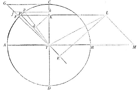 我们曾说过,面积,它由向地球引半径的月球画出,与时间成比例,但月球的运动由于太阳的作用而受到的扰动除外。我们计划在这里研究[在扰动的情况下]瞬的不等性,或者小时增量。为了使计算更容易,我们想象月球的轨道是圆形的,且除了这里讨论的不等性之外,我们忽略其他一切不等性。由于太阳的巨大的距离,我们也假设直线SP,ST彼此平行。按这种方式,力LM总被化为其自身的平均量TP,且因此力TM将化为其自身的平均量3PK。这些力(由诸定律的系理II)合成力TL;且如果向半径TP落下一条垂线LE,这个力被分解为力TE,EL,其中的TE总沿半径TP作用,对由那个半径TP画出的面积TPC既不加速,也不迟滞;而EL,它沿半径的垂直方向作用,按照它对月球加速或者迟滞的大小,加速或者迟滞画出的面积。月球的那个加速度,在它自方照C到合A的路径中的每一个瞬间所成的,如同加速力EL自身,这就是,如同 。时间由月球的平均运动,或者(这几乎得出相同的结果)由角CTP,或者由弧CP表示。以直角在CT上竖立CG等于CT。且圆周的四分之一弧AC被分成无数相等的小部分Pp,等等,由它们相同数目的相等的时间小段能被表示,又引pk垂直于CT,连结TG交KP,kp的延长于F和f;则FK等于TK,且Kk比PK如同Pp比Tp,这就是,按照给定的比,且因此FK×Kk或者面积FKkf,如同 ,亦即,如同EL;且由复合,整个面积GCKF如同在整个时间施加于月球的力EL的总和,因此也如同由这个和生成的速度,亦即,如同画出面积CTP的加速度,或者瞬的增量。力,由它月球能在其27天7小时43分钟的循环时间CADB,以距离TP围绕静止的地球运行,它使一个物体在时间CT下落,画出 CT的一个长度,并获得一个速度,它等于月球在自己的轨道上运动的速度。这由第I卷命题IV系理9是显然的。但是,因为向TP垂直落下的Kd是EL的三分之一,它等于在八分点的TP的或者ML的一半,在八分点的力EL,在这里它最大,按照3比2之比超过力ML,且因此比那个力,由它月球能在自己的循环时间围绕静止的地球运行,如同100比 ×17872 或者11915,则在时间CT应生成一个速度,它是月球速度的 ,但在时间CPA按照CA比CT或者TP之比,生成较大的一个速度。设在八分点的最大的力EL用等于矩形 TP×Pp的面积FK×Kk表示。且速度,它能由最大的力在任意时间CP生成,比一个速度,它由较小的力EL在相同的时间生成,如同矩形 TP×CP比面积KCGF;但在整个时间CPA生成的速度彼此如同矩形 TP×CA和三角形TCG,或者如同四分之一圆的弧CA和半径TP。且因此(由《几何原本》第V卷命题IX)后一速度,在整个时间所生成的,是月球的速度的 。对月球的这个速度,它与面积的平均的瞬相似,加上并减去另一个速度的一半;且如果平均的瞬用数11915表示,则和11915+50或者11965表示在朔望A时面积的最大的瞬,且差11915-50或者11865表示在方照时同一面积的最小的瞬。所以,在相等的时间在朔望和在方照画出的面积,彼此如同11965比11865。最小的瞬11865加上一个瞬,它比瞬的差100如同四边形FKCG比三角形TCG(或者结果一样,如同正弦PK的平方比半径TP的平方,亦即,如同Pd比TP);则和表示当月球在居间的任意位置P时面积的瞬。