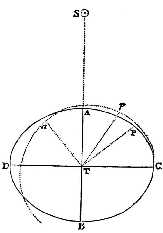 这一不等性部分地起源于月球的轨道的椭圆形状,部分地来自面积的瞬的不等性,面积由向地球引半径的月球画出。如果月球P在椭圆DBCA上围绕在椭圆中心静止的地球运动,且向地球引的半径TP画出的面积CTP与时间成比例;又椭圆的最大半直径CT比最小的半直径TA如同70比69;角CTP的正切比从方照C算起的平均运动的角的正切,如同椭圆的半直径TA比它的半直径TC或者69比70。但当月球自方照向朔望前进时,面积CTP的画出应如此被加速,在月球的朔望它的瞬比在方照它的瞬如同11073比10973,且使在任意中间位置P时[面积的]瞬对在方照时[面积的]瞬的超出如同角CTP的正弦的平方。这会足够精确地发生,如果角CTP的正切按照数10973比数11073的二分之一次比减小,亦即,按照数68.6877比数69之比减小。由此,角CTP的正切现在比平均运动的正切如同68.6877比70,且在八分点,那里的平均运动为45gr.,发现角CTP为44gr..27′.28″,从平均运动的角45gr.中减去它,剩下最大的变差为32′.32″。事情将会如此,如果月球自方照向朔望前进只画出九十度的角CTA。但是,因为地球的运动,由此运动太阳的视运动被前移,月球,当它赶上太阳时,画出的角CTa按照月球的会合周期的时间比它运行的循环时间,亦即,按照29d..12h.44′比27d..7h.43′的比大于直角。且按这种方式围绕中心的所有角接相同的比被扩大,而最大的变差不再是32′.32″,现在按相同的比增大为35′.10″。