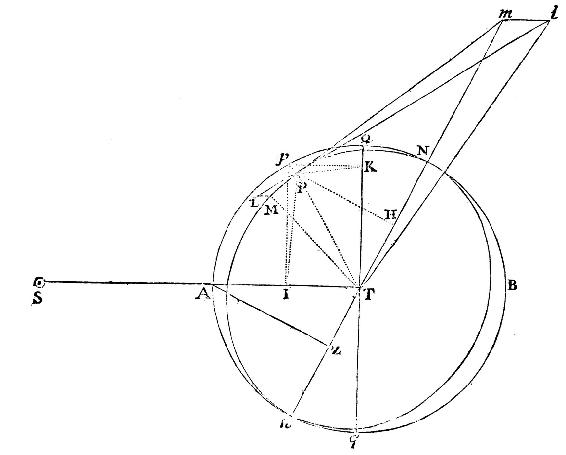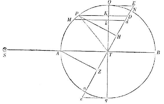 系理2 在交点的任何给定的位置,其小时平均运动是在月球的朔望时的小时运动的一半,且因此它比16″.35.16iv.36v的比如同交点离朔望的距离的正弦的平方比半径的平方,或者如同AZqu.比ATqu.。因为如果月球以均匀的运动经过半圆QAq,在月球从Q前进到M期间,所有的面积PDdM的和是面积QMdE,它由圆的切线QE界定;且月球到达点n的时间,那个和是整个面积EQAn,它由直线PD画出,然后月球从n前进到q,直线PD落在圆的外面,并画出由圆的切线qe界定的面积nqe;它,因为交点在前面退行而现在前行,应从前者的面积中减去,且因为它等于面积QEN,剩下半圆NQAn。所以在月球画出半个圆的一段时间,所有面积PDdM的和是半圆的面积;且在月球画出一个圆的时间所有的面积的和是整个圆的面积。但是面积PDdM,当月球在朔望时,是弧PM和半径PT之下的矩形;且在月球画出一个圆的时间,等于这个面积的所有面积的和是整个圆周和圆的半径之下的矩形;且这个矩形,由于它等于两个圆,是前一个矩形的两倍。因此,如果交点以它们在月球的朔望所具有的速度均匀地持续,它们将画出二倍于它们实际画出的空间;且所以平均的运动,如果以它均匀地持续,能画出它们以不等的运动实际画出的空间,是它们在月球的朔望所具有的运动的一半。因此,由于最大的小时运动,如果交点在方照,是33″.10.33iv.12v,在这一情形的小时平均运动是16″.35.16iv.36v。且由于交点的小时运动总如同AZqu.和面积PDdM的联合,且所以交点的小时运动在月球的朔望如同AZqu.和面积PDdM的联合,亦即(由于画出的面积PDdM在朔望被给定)如同AZqu.,平均运动也如同AZqu.;且因此这个运动,当交点在方照之外,比16″.35.16iv.36v,如同AZqu.比ATqu.此即所证。