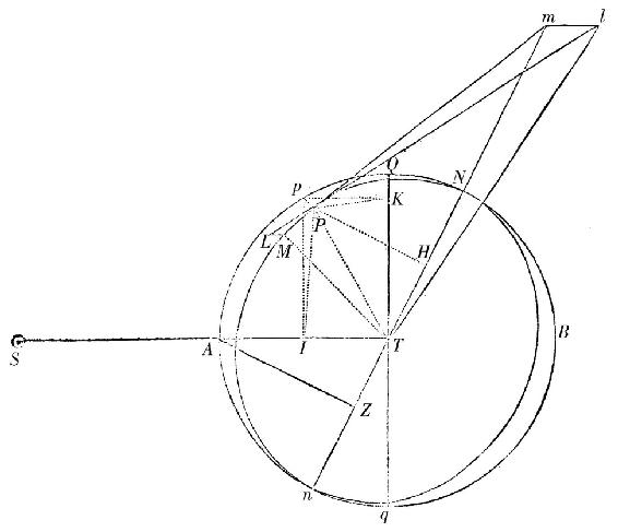 现在指定PM为一段弧,它由月球在给定的极短的时间画出,且ML为一条短线,在相同的时间月球在施加所说的力3IT的情况下能画出它的一半。连结PL,MP并延长它们至m和l,在那里它们与黄道的平面相截;又在Tm上落下垂线PH。又,因为直线ML平行于黄道的平面;且因此,由于直线ml位于那个平面上,它们不可能相交,然而这两条直线位于一个共同的平面LMPml上;这些直线平行,且由此三角形LMP,lmP相似。现在,由于MPm在轨道的平面上,在其上在位置P的月球在运动,Mpm交过那个轨道的交点N,n引的直线Nn于点m。又由于力,由它短线LM的一半被生成,如果整个力同时且一次施加于位置P,将生成那整条直线;并使月球沿其弦为LP的弧运动,因此月球从平面MPmT上被迁移到平面LPlT上;由那个力产生的交点的角运动等于角mTl。但是ml比mP如同ML比MP,且所以,由于MP因为时间的给定而被给定,ml如同矩形ML×mP,亦即,如同矩形IT×mP。又,角mTl,只要角Tml为直角,就如同(ml)/(Tm),且因此如同(IT×Pm)/(Tm),亦即(由于Tm和mP,TP和PH成比例)如同(IT×PH)/(TP),由于TP给定,因此如同ML×PH。但是,如果角Tml,或者角STN是倾斜的,角mTl按照角STN的正弦比半径,或者AZ比AT之比而更小。所以交点的速度如同IT×PH×AZ,或者如同三个角TPI,PTN和STN的正弦之下的容量。