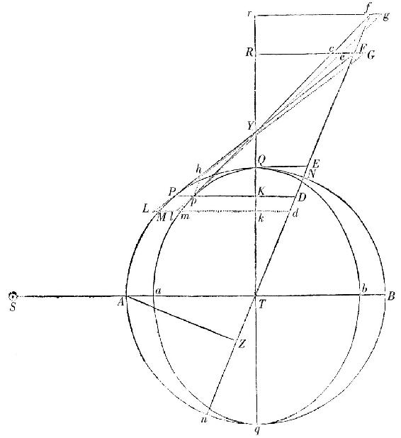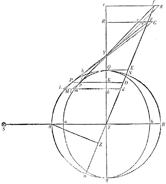 指定Qpmaq为以长轴Qq,短轴ab画出的一个椭圆,QAqB为一个外接圆;T为在两者公共的中心的地球,S为太阳,p为在椭圆上运动的月球,且pm为在给定的极短的时间段月球画出的弧,N和n为由直线Nn连结的交点,pK和mk为落在轴Qq上的垂线并向两边延长直到它们交圆于P和M,且与交点线交于D和d。再者,如果月球,由向地球引的一个半径,画出的面积与时间成比例,在椭圆上的交点的小时运动如同面积pDdm和AZq的联合。