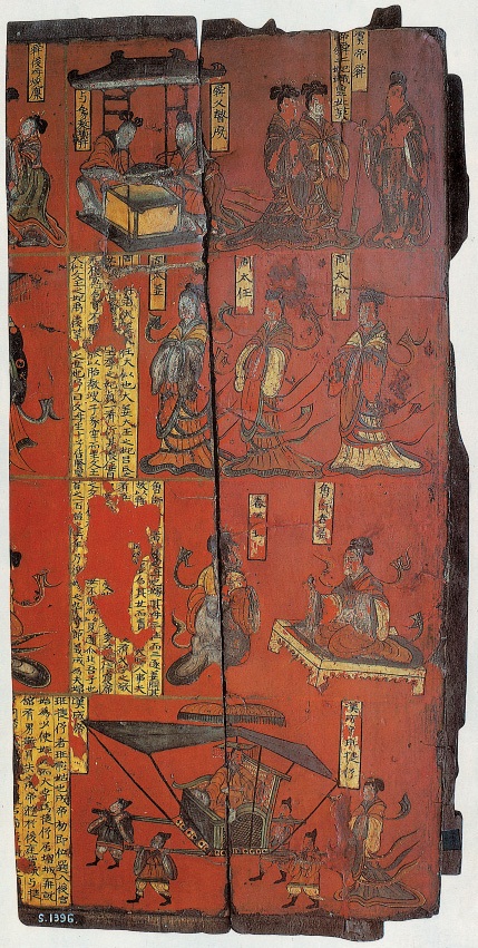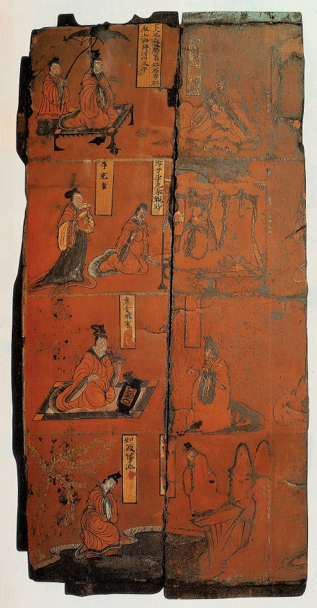 漆昇风画始于 周代,兴盛于汉、 魏、六朝,是封建上 层社会享用的奢侈 品。该屏风画共五块,以汉代刘向《古列女传》内容入画, 主要表现帝王、将相、列女、孝子,以及高人逸士的故事,这里选录两幅。 画以红色作底,勾墨线,线条飘逸自如,色彩富丽华美。
