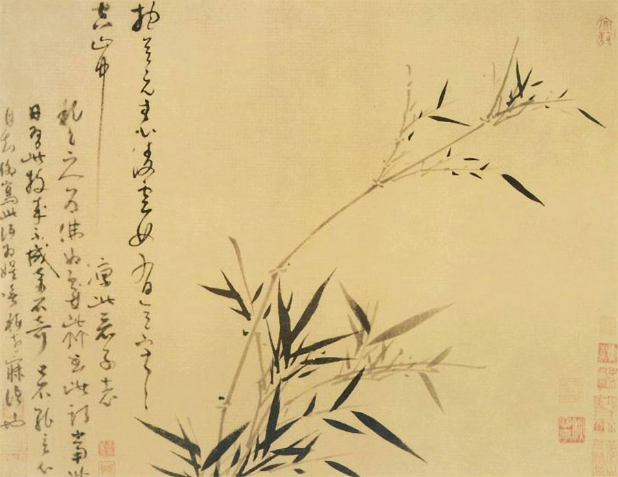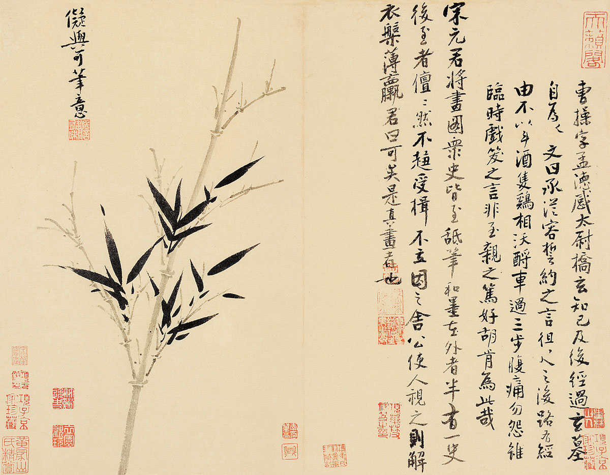 《墨竹谱》共计二十四开,是吴镇画竹的代表作。每幅之中竹的姿态、欹正仰俯、阴阳向背皆有所不同,笔法 简洁苍劲。在此选其中两幅,其一写新篁始出,旁衬粗竹劲干和润秀竹笋,笔墨浓淡有致,富有情致;其二为雪竹,不以墨彩渲染烘托,而直接以淡墨草写雪意,枝叶在雪中的掩映露藏、弯曲而又暗含张力的形态都表现得淋 漓尽致。