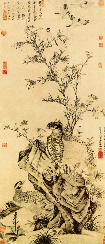 竹石集禽图 元·王渊 纸本水墨 纵137.7 X横59.5厘米 上海博物馆藏