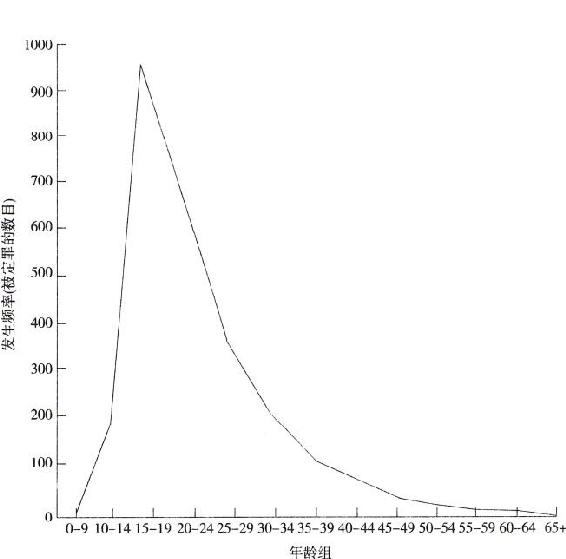 我根据初次作案时的年龄对这些罪犯进行了列表分析,发现总体的年龄范围是9至80岁,在2717名罪犯之中,男性2180人,女性537人,男女比例大概是4比1。但是,在932名初次犯案时为15至19岁的罪犯中,男性777人,女性155人,男女比例大概是5比1。