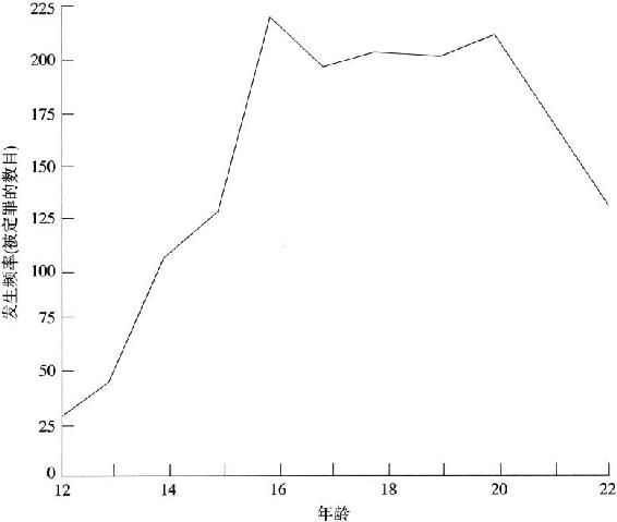 图表3表明了我的样本中这2717名罪犯初次犯案的年龄,以体现不同年龄段犯罪的相对发生率。从图表中可以发现,从14岁开始,初次犯案的发生率明显增加,在15—19岁时达到高峰。通过对样本中年龄在12—22岁之间的初次犯罪者更加详细的分析表明(见图表4),在青春期的初期阶段,犯罪率急剧上升,在16岁时达到一个明显的顶峰,而在青春期剩余的几年中则保持了较高水平的平稳状态。