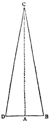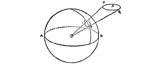 “我以下述方式来考虑这个问题。设想CA是垂直地落到直线BD之上的一条光线;于是,若眼睛静止在A点,则不论光线的传播是费时的还是即时的,目标都必定出现在AC方向上。但如果眼睛从B移向A,并且光线的传播是费时的,其速度与眼睛速度之比等于CA与BA的比;那么,当眼睛从B移动到A时,光就从C运动到A,眼睛在B时,借以识别目标的光微粒在C,当眼睛运动时,这微粒便到达A。连结B、C两点,我设想,线CB是一根其直径只允许通过一个光微粒的管子(与线BD成倾角DBC)。于是,不难明白,如果C处的那个光微粒(当眼睛运动而到达A时,借助这微粒一定能看到目标)与BD成倾角DBC,则它将通过管子BC,并伴随眼睛从B运动到A;如果这微粒与BD成任何其他倾角,则它就不能到达眼睛,而处于这根管子后面。……虽然一个目标的真实或实际位置因此与眼睛运动的路线垂直,但其可见位置却不如此,因为这位置无疑必定处在这管子的方向上;然而,真实位置和视在位置之间的差别(其他条件相同之下)或大或小,取决于光速与眼睛运动速度之比的大小。……如果光的传播是费时的(我想,这一点是当代大多数哲学家容易接受的),则由前述考虑显见,一个目标的真实位置与可见位置之间将总是存在差别,除非眼睛直接朝向或背向这目标运动。在任何情况下,这目标的真实位置和视在位置夹角的正弦,同这目标和眼睛运动路线所成可见倾角的正弦之比,都将等于眼睛速度与光速之比。”(S.P.Rigaud编:Miscellaneous Works and Corrspondence of the Rev.James