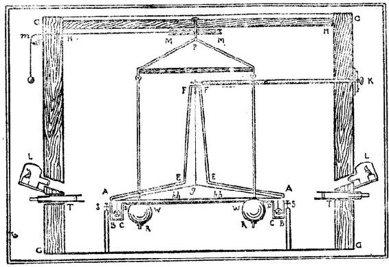 这种装置主要包括两只小铅球,它们由两根短金属线悬挂在一根木梁的两端,木梁在其中点处由一铜纽丝悬吊起来,整个装置放在一个密闭的盒子里,以免受气流影响。这木杆的方向可用一根固定标尺和游标确定,通过望远镜在木梁两端观察读数。在密闭盒子外面再放两只大铅球,使它们分别在木梁两侧靠近小铅球,以便藉它们的吸引而使木杆转动一个可加以测定的角度。然后,把每个大铅球都移到梁的另一侧,以使梁按相反方向转动,再读出转动角度。这两组读数之差的一半,便给出这些球体相互吸引而产生的平均偏转。在每种场合,这系统均在因球体吸引而产生的一个力偶,和因铜丝的扭转而产生的、且与铜丝扭转角度成正比的一个回复力偶的结合作用下,处于平衡状态。列出这两个力偶的表达式,使它们相等,便可用实验中很易得出的数据来表达地球的平均密度。这些数据中,包括悬吊金属丝的扭转常数,它可以用这系统的转动惯量及其扭转振动周期来表达,而后者可以通过一个辅助实验测得。于是,代换这几个量,便得出地球平均密度,它为水的密度的5.488倍(