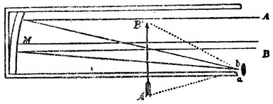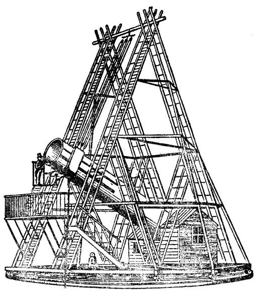 赫舍尔迁居斯劳以后不久,便开始建造他那最大的望远镜——焦距40英尺的巨型反射望远镜(图45)。他耗资4000镑,在十个助手协助下,花了四年时间制成它。1795年的《哲学学报》(pp.347—409)上载有关于它的详尽说明。按照他的说法,它是“前视式”,而现在称之为“赫舍尔式”。他写道:“它的观察目镜的位置稍微偏离轴,但直接在前面,中间不插入一面小反射镜;同过去制造的望远镜相比,它的主要优点是给出几乎强一倍的光”(Catalogue of One Thousand new Nebulae and Clusters of Stars,Phil.Trans. ,1786,p.457ff. ,note)。由于观测者的头部要挡住一部分光线,所以,这种结构只适合于大型仪器,现在已很少见。望远镜的镜筒长39英尺4英寸,直径4英尺10英寸。镜筒由铁板焊接而成,不用铆钉。镜筒下端加以特别加固,以支承反射镜,并提供一个可让整个镜筒在其上面沿一垂直平面转动的支枢。仪器的复杂构架用来支承镜筒,使能借助适当的滑轮把镜筒抬高到直至天顶的任何高度,并使观测者便于接近目镜。整个构架安装在两组可在圆形砖墙轨道上滚动的滚轴上,这样,望远镜就可指向任何地平经度。观察台(望远镜正面可以看到)可容纳很多人;可从一道阶梯到达这观察台,并可停在任何所希望的位置上。还有一个平台,任何实际使用这望远镜进行观测的人都可使用。棚屋供记录观测(通过一根通话管告诉他)的助手和需要时移动望远镜的工人使用;参考书、钟表和辅助仪器也可存放在那里。总的来说,这架40英尺望远镜的工作是令人失望的,因为镜在将近一吨自重的作用下发生变形,而且很快便失去了光泽。整个装置移动起来也嫌笨重。
