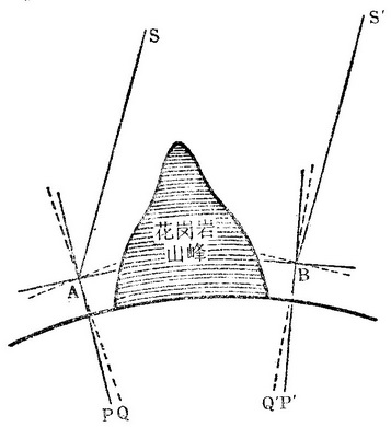 马斯基林曾作过一次测定地球质量或平均密度的有趣尝试。为此,他测量在一座山附近的一条铅垂线的偏转,这山对铅锤的水平拉力可与地球的向下拉力进行比较。布格埃1740年前后在秘鲁测量一条子午弧时发现,他的铅垂线由于受钦博拉索山吸引而偏转约8秒。他得到了对地球和这山的相对密度的估计数值。这种估值已证明是根本不对的:但是,这一尝试激励马斯基林三十年后在珀思郡的希哈莱昂山附近作类似的研究。这是一座花岗岩山峰,高3547英尺。马斯基林之所以选中它,是因为它山势陡峭,形体规则。1774年作观测而进行的这项研究的原理示于图41。A和B是所选定的两个观测站,一个在山的南边,一个在山的北边。从每个观测站仔细测量一些选定的恒星的子午天顶距,得出A、B两地的视在纬度差约为55秒。这个差值中,约为43秒的部分可归因于A、B两地的地理纬度差,因为从勘测中知道,取决于地球的曲率和A、B两地的间距(如由勘测作业可知)。剩下的约12秒的差值则起因于铅垂线受山吸引而从AP、BP′方向(假设那里无山时,铅垂线本来应取的方向)偏向AQ、BQ′方向。偏转程度即量度了地球和山的相对质量,这样便可粗略计算出地球的平均密度。为此目的,马斯基林和数学家查尔斯·赫顿合作,在计算中把山的体积、山的构成物的密度以及山各部分和两个站的距离都考虑到,所得到的最后结果是:地球的平均密度约为水的