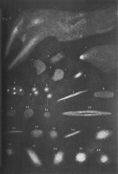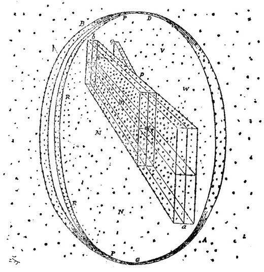 赫舍尔最早的科学论文是在短命的巴思哲学学会宣读的,论及了各种各样的问题,除了天文学和偶尔谈及的形而上学问题而外,还涉及了电、光、重力和“鲁伯特滴剂”,等等。他对天文学比较成熟的贡献主要记叙在1780到1821年的《哲学学报》刊载的论文里,大多是关于各种恒星问题。十七世纪,抛弃了古代关于恒星不动地固定在一个水晶球表面的教条,随之便产生了一个问题:那么,恒星在空间中是如何分布的呢?赫舍尔致力于解答这个问题。显然,恒星在天空的某些部分(例如在银河中)要比在其他部分更密集地聚拢在一起。从1783年起,赫舍尔开始用他所说的“恒星计量”对天空每一部分中恒星的分布密度进行定量测量。他有计划地把他的望远镜对准天空的一个又一个部分,计算望远镜每一位置上视野里他能看到多少颗恒星,这种计量总共做了上千次。在有些方向,他所使用的放大率平均每次只能看到一颗恒星;而另一些方向上,他能数到五百颗以上。赫舍尔尝试地假设,在每一方向上,恒星的视在聚集可以认为表明了这星系在那个方向上的广延。他还假设,恒星大都固有地具有同等亮度,因而一颗恒星的视在昏暗程度是对它与我们距离的量度。根据这些假设,以及作为他的恒星计量的结果,他得出结论:银河是一端开裂的恒星层,太阳处于稍微偏离其中心的位置。(参见Phil.Trans. ,1784,1785。)所以,银河系恒星看去像一个部分开裂的大圆投影在天球上。后来,他进而认为银河系形似一面凸透镜或一个小圆面包;他还设想,太阳处在把银河分成两半的平面上;这一结论得到了现代更精密的研究的支持。然而,赫舍尔认识到,有些区域中的恒星比其他区域中的更密集,因此,随着时间的推移他逐渐感到必须认识星团。起初,他把这些天体归类于他在计量作业过程中用望远镜看到的大量各种形状的星云;他认为,如有足够强大的望远镜,所有星云均可分辨为恒星。但是,后来他又得出结论,断言其中包括本质上不同的若干类型的天体,并试图找出从弥漫的不规则星云到盘状体、历经各种类型的演化序列,他认为盘状体可能生成恒星(图48)。关于我们现在称为“环状星云”的天体(我们从各个不同方面观察,它们看起来像透镜的样子),赫舍尔认为,它们是一些可与银河所包围的星系相比的“宇宙岛”。这个观点近年来又重新得到支持,尽管如赫舍尔似乎曾设想的那样,现在已认识到,环状星云大都不是已形成的恒星集合,而基本上是现仍在凝聚而生成恒星的气体团,在这个过程中其中有一些比另一些处于更高阶段。