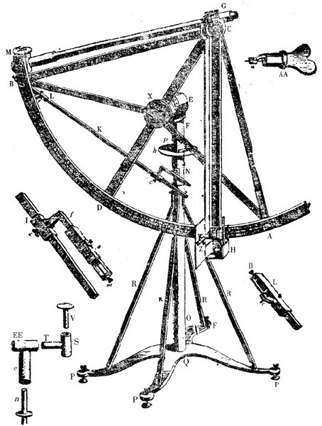 在观测中天时,望远镜被置于接近所需高度,并旋紧一颗螺钉,使板mn被夹紧在分度弧上。当星进入视野时,用长螺杆op进行微调,使目镜缓慢地沿分度弧上下移动。可借助一个小游标读出这象限仪的精确定位。