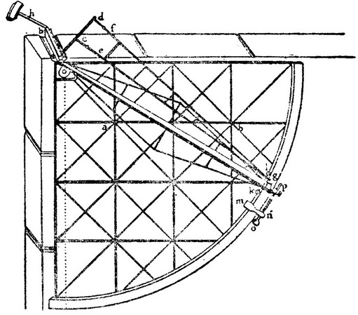 乔治·格雷厄姆于1725年在格林威治天文台所建造的墙象限仪(参见Smith的Opticks,1738,Vol.Ⅱ,p.332ff.)是十八世纪最著名的墙象限仪之一。这象限仪构架由细铁条构成,一些铁条以扁平表面与象限仪平面平行放置,另一些则以边缘向着象限仪平面。所有的铁条都用许多铆接在它们间夹角上的角铁牢固地连接起来,以确保结构尽可能坚固。象限仪的分度弧由两个半径约8英尺的90°金属弧构成,其中一个是铁的,另一个是铁的,但覆盖有黄铜,黄铜还有一部分伸出铁弧之外。安装之前,先把黄铜弧放在一个水准平面上,用一个由径向臂上转动的一把铁刮刀扫刮它,使它成为一个真平面,这径向臂可绕一根穿过象限仪中心的垂直轴转动。然后给黄铜边缘上的两个同心弧刻度。内侧弧被划分成度和十二分之一度,外侧弧被分成一条60°的弧和一条30°的弧,两者再通过逐次分半而分别分成64份和32份,即总计96份,每一份又被细分成16份。这两个独立标尺构成一种相互检验。当定位在这两个标尺上读出,并化为相同单位时,其结果之差很少发现超出几秒。象限仪固定于一堵用易切石专门建在子午面上的墙的东侧,以覆盖子午圈南面的四分之一。哈雷曾计划建造一架相似的象限仪以覆盖北面的四分之一。这项工作开始后,因资金不足而中止。仪器的全部重量由墙壁上伸出的两根铁销来支持,铁销在a和b处穿过铆接在象限仪上的铁板上的两个孔。a处的销子是不可动的,而b处的销子可以升降,以便能调定两个边沿半径的位置,使一个沿水平方向,另一个沿垂直方向。用这架象限仪和近傍的哈雷中星仪同时进行中天观测,就可调节象限仪平面,或者至少望远镜轴所扫过的平面,使其与子午圈相重合。象限仪经调整后,用砖石建筑上的夹具固定位置,并用一根铅垂线检测其位置的累进变化。然而,哈雷在格林威治天文台工作的后期,这架象限仪已严重失修。
