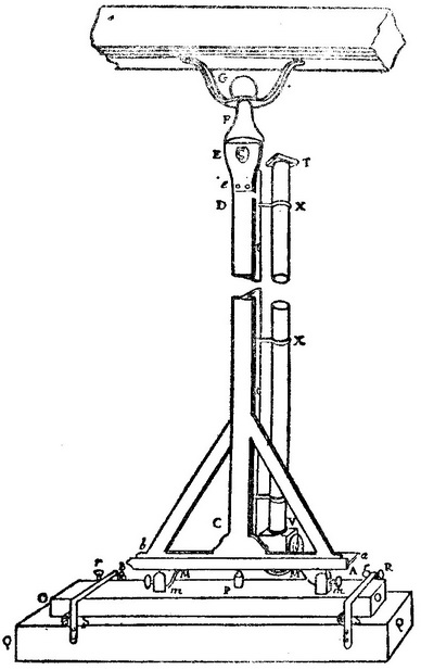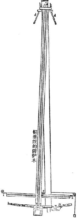 这一时期另一种值得注意的天顶仪是拉孔达明在南美进行大地测量时所使用的仪器;在他的《子午圈三个基本度的测量》(Mesure des trois premiers degrés du méridien)(巴黎,1751年)中载有关于这种仪器的描述,拉朗德也对之作过说明。这里从拉朗德的《天文学》(Astronomie)中引出如下说明和图解(1771—81ed. ,Vol.Ⅱ p.781ff.)。望远镜VT牢固地安装在半径CDG上,后者可绕G在子午面上自由地做偏离垂直位置的小角度转动。半径下端有一根横档AB,上面有一条刻在一个铜分度弧上的约8°的刻度弧,从弧的几何中心E处的一根销钉悬下的一根铅垂线EP横在这刻度弧上。半径从C到D长12英尺;它由彼此成直角地固定起来的扁平铁条构成,保证其坚固。它顶上覆盖着一个带有悬吊着铅垂线的销钉E的铜件EFG,其端末为一个球状头G,其颈部可在固定于有牢固支持的横梁的一个项圈中活动。这样,半径就得到了带一定程度自由的支持,观测者就可以清楚地看到天顶。横档AB长2英尺;两个舌M、M向下伸出,嵌入金属枕块m、m的沟槽中。两个枕块固定在一根坚固的梁OO上,梁OO则安放在稳固的基座QQ上,并可沿其长度方向(南北向)移动,从而使望远镜可偏离天顶向两边略微倾斜几度。当望远镜近似地置于所需的天顶距时,用螺钉r,r把梁OO夹紧,并可用螺钉m、m进行微调。望远镜的实际位置由铅垂线与刻度弧的交点的刻度示出,并且借助测微计V可得到更高的精确度。