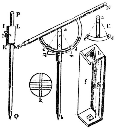 十八世纪有几种望远镜专门用于测定太阳或一颗恒星在越过子午圈之前和之后处于相同地平纬度的时间,这些时间的平均值就是实际的中天时间。前面谈到的P.C.勒莫尼埃的中星仪就常常这样使用。罗伯特·史密斯(Opticks,Vol.Ⅱ,p.329)描述的另一种这样的仪器主要由一个30英寸长的望远镜MN构成。支持望远镜的是一根同样长度的钢轴ab;这根轴直立于一个可以说是长方形盒子之中,盒子牢牢地固定于一根柱子,轴绕其尖底端b自由转动,b置于i处的一个轴承之上,而轴的圆柱体部分e在h处的轴环中转动。这根轴上装着一个60°的小金属弧cd(如E处所示),弧的中心a位于轴ab的顶端。望远镜固定于一个金属半圆的直径之上,半圆有着与金属弧相同的半径和圆心。这个半圆正常时可在金属弧上自由滑动,由两个螺钉c、d夹住在这弧上,弧穿过半圆上一个狭缝而进入弧上的孔中;只要旋紧这些螺钉,望远镜就可夹持在地平线上任何所需的仰角上。为使轴ab处于垂直位置,可通过旋动螺钉而移动基座i,直到在轴慢慢转动时气泡水准器1m仍保持水平状态为止。当望远镜被夹持于某一位置时,就成了一个高度方位仪,扫出一个等地平纬度的圆。在子午圈东侧选择一颗星,用地平纬度固定的望远镜跟踪这颗星,使这颗星保持在视野中两根垂直线之间(k),记录下它越过五根水平线的每一根的时间。当这颗星越过子午线后又进入仍处于相同定位的望远镜的视野之中时,再把它越过五根水平线的时间记录下来,而这十个时间的平均值便取为这颗星的中天时间。
