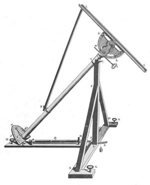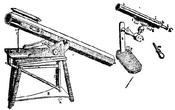 这个时期的赤道仪大都有这样一个制造造成的缺点:它们不能转到指向北极星,有时实际上不能指向北极星周围30°范围内的任何星。梅尼1774年制造的赤道仪就没有这种缺陷(拉朗德的上引著作,Vol.Ⅳ,p.666和p.669f.)。望远镜VL和赤纬圈IK处于赤纬轴HX的两对端;仪器很快就可调节到适用于任何纬度,为此,将可活动的半圆FG转动必需的角度,使EQ定位于赤道平面。但是,在观测高的目标时,观测者的头部就没有多少活动余地了(见图62)。