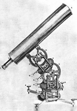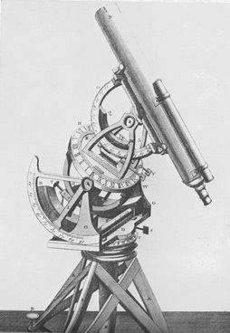 我们接下来论述望远镜用于下述目的的装置方法。这种用途在于希望仪器能容易地瞄向某个天体目标,使这个目标在视野中保持一段短时间,以便进行观察或测微。这通过如此装置的望远镜来实现,即使之能绕一根与镜长垂直的轴转动,而这根装着这望远镜的轴又可绕第二根轴转动,第二根轴与第一根轴垂直。望远镜有了这样的自由度,就能指向天球上任何一点(实际上还要除去其运动受部分支承结构阻碍的地方,这是早期各种型式装置中常常出现的现象)。这一般说明包括种种特殊情形,这里我们主要关心其中一种,即望远镜在与赤道垂直的平面上绕一根位于赤道的轴转动,这根轴又绕第二根与地球周日自转轴平行的轴转动。望远镜藉之定位的分度圆上的读数在这里就表示被测星的赤纬和时角。