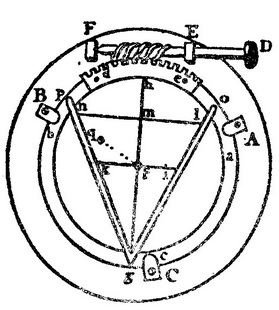 在应用这样的测微计时,经常需要调节相交的金属丝在视野中的定向,从而使其中某一根通过两个所选取的星象,或与星漂越视野的方向平行。在詹姆斯·布莱德雷的几种测微计(见史密斯的描述,Opticks,Vol.Ⅱ,pp.344—45)中,这种调节颇为简便。他把金属丝装在环abc上,后者可在一个较大的同心环ABC上刻出的一条圆沟槽中在其自身的平面上转动,而大环固定在望远镜的焦平面上。gh、ik和ln分别表示几根金属丝。螺杆DEF与由螺钉固定在内环上的扇形齿轮de啮合。旋动DEF,就可将内环转动到任何所需的位置,由A、B和C处的凸出部把内环置于沟槽之中。黄铜杆go和gp固定于内环上,用于测定两颗靠近的星的赤纬差。这两根杆成这样的倾角,使两颗星越过视野的路径ln、ik之间的垂直距离mf等于这两条路径被两根杆所截部分之差(ln-ik)。因此,根据两颗星从两杆之间通过所花时间之差,就可容易地推算出它们的赤纬之差。