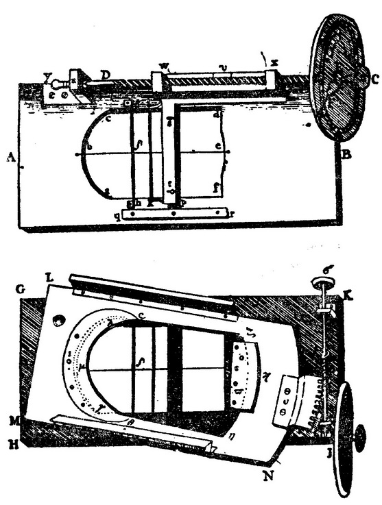 按传统方式工作的十八世纪最成功的测微计之一示于图66。(参见Opticks,Vol.Ⅱ,p.345ff.;和La Lande:Astronomie,Vol.Ⅱ,p.768ff.)这种仪器可能是格雷厄姆设计的。一块长方形黄铜板AB上挖出一个洞abcdef,一根水平金属丝be横跨这个洞。两根竖立的细杆gh和ik也横过这洞,其中gh是固定的,而ik则可通过旋动测微螺杆CED而侧向地向两个方向运动。测微螺杆上装有指标,在刻度盘EF上示出螺杆转动的整周转数和不满一整周的分数,这相应于细杆gh和ik的间距。整个仪器原来准备插入望远镜的焦平面,但其原始设计经布莱德雷改进。布莱德雷不把仪器直接装到望远镜上,而是把它装在一个黄铜底板上(图66下图中的LN所示)。当旋动与装在底板LN上的一个扇形齿轮啮合的蜗杆στ时,仪器就可在其本身平面上绕丝be与固定杆gh的交点δ转动。借助沿这底板两边的凸出部而固装于望远镜镜筒的就是这个底板。利用这种装置,测微计的定向就可无需把望远镜作为一个整体绕其轴转动而加以改变了。1771年,拉朗德还在使用着这样的测微计,他认为这是当时最佳的通用测微计。