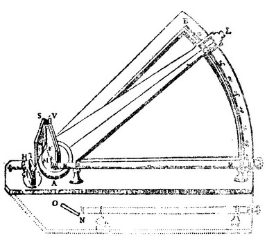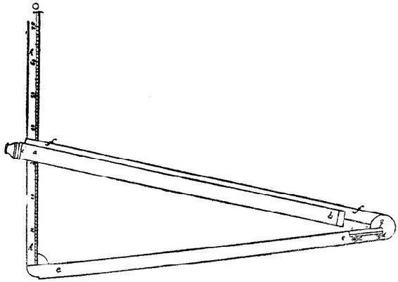 胡克看来在1666年8月22日向皇家学会提出过一种“新式的通过反射测量距离的天文仪器”。他遵照皇家学会的吩咐进行制造,翌年9月12日交出(Birch:History of the Royal Society of London,1756—7,Vol.Ⅱ,pp.111—4)。这可能就是沃勒在《胡克遗著》(Posthumous Works of Robert Hooke)(1705,p.503)中提到过的那种仪器。该书中有这样一段话:“我在此还要描述一种仪器,它用来测量在一个方向上的角度。我是在一张散页上发现它的说明的。ee、ff为两把长直尺或长臂,在一个接合点或中心点g处张开;hh为一根分为一千份的直尺,借助一张弦表测量g处的角度;ab是固定于直尺ff上的望远镜,这样,望远镜的中间就可垂直于直尺的内侧。a为瞄准器的部位,b为物镜,i为目镜;cc为反射镜,它的边缘刚好与中心点g相触,镜面cc与直尺ee的内侧在同一平地〔原文如此〕上,镜的背面是一块黄铜片,带有两个垂直的耳状物dd,藉之用螺钉把铜片固定于直尺ee上。”可见胡克的仪器仅用一面反射镜,而没有用两面反射镜,这样,光的损失可减少一些,尽管当入射光线非常斜时,反射像会有些漫散。但是,这种仪器也有缺点。譬如,当在海上用它测量地平线上的一颗星的地平纬度时,按要求把仪器调整固定好以后,海面就完全被掩藏在反射镜后面,而这颗星便处于视野之外。
