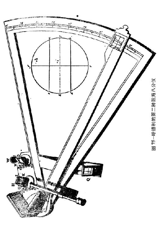 约翰·哈德利的“新的测量角度仪器”的最早说明是在1731年5月13日在皇家学会宣读的,后来发表于《哲学学报》(Vol.Ⅹ Ⅹ Ⅹ Ⅶ,p.147)。它提出了这种仪器的两种可供选择的结构形式。对第一种结构,文中描述如下:“这仪器乃是一个八分仪ABC,分度弧BC为包括45度的半圆,分为90等分即半度,每一等分在观测中相当于一个整度。指标ML可绕中心转动,而标示出分度。在中心附近,一面平面反射镜EF与仪器平面垂直地固定在这指标上,并与指标的中线成这样的角度,即使得这仪器便于适合其预定的种种特定用途……IKGH是另一面较小的平面反射镜,它在八分仪上固定的位置同样取决于特定用途。这反射镜的表面处于这样的方向:当指标指示分度的起点(即0°)时,它能精确地平行于另一面反射镜的表面,此时,这反射镜转向观测者,而另一面反射镜则背离观测者。PR为固定于八分仪一边的望远镜,其轴与该边平行,并从反射镜IKGH的两边IK或IH之一的中线附近通过,以便其物镜的一半能接收由这反射镜反射的光线,而物镜的另一半仍直接接收一个遥远目标射来的光线……ST是一片固定在一个框架上的黑玻璃,框架可在一个销V上转动;当目标中有一个光线过强时,便可把这黑玻璃置于反射镜EF之前。”图75示出哈德利仪器的第二种结构,其特点是把望远镜横跨八分仪的半径地放置;这就是这种仪器至今一直采用的形式。我们今天所称的标镜的表面与其基准线重合。起初所使用的是金属镜,但后来发现其失去光泽,因而便用涂银玻璃板取代之。水平镜IKGH的涂银的一半极其接近仪器的平面。(第三面镜NO用于测量90°以上的角度的场合,W、Q为敞口瞄准器,可与望远镜交替使用,或互换使用。)哈德利的仪器在实用上有着比胡克和牛顿的仪器优越的地方,即其间距被测的两个点的像可以被弄得沿水平镜IKGH的一个边相切,该边与仪器平面平行,这样两个像便在仍被完全看到的情况下又相重合。