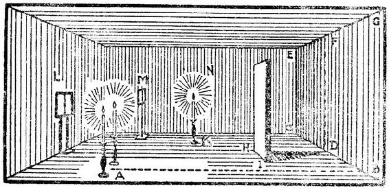 《光度术》第一部分第二章研讨了各种形状表面发出的光的数量的问题。兰伯特所使用的光度计与后来以朗福尔德命名的仪器非常相似。他比较了两个表面的照明度,一个由已知光强的光源照明,另一个由光强有待确定的光源照明。他的设备示于图85。K和A处为两个要被比较的光源;BDCEFG是一堵光滑的白色墙壁,其前方HI处放置一个不透明的屏。光源A投下这屏的阴影,后者覆盖墙壁上的DCEF部分,而由K投下的阴影落在BDFG部分。这样,BDFG部分就仅被光源A照明,而DCEF则仅由K照明。然后,把其中一个光源前后移动,直到墙上直线DF两侧显得亮度相同,这时通过简单测量就可测定两个光源的相对光强。