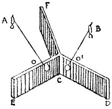 这架仪器上有两个不透明的屏EC和CD,其上有开孔O和O′,每个开孔上都放有透明的屏(图84)。每个孔都用被比较的两个光源中的一个照明。在两个光源之间放了一块隔板F,以使每个光源都产生其独自的效应。调节AO、BO′这两个距离,直到眼睛从前面看去,两开孔处的屏呈现出同样亮度。这样就可知道,每个光源的光强与其离开被照明屏的距离的平方成正比。布格埃根据这条一般原理还设计了几种其他类型的光度计。他用这些仪器表明了,光反射时所伴有的光的吸收如何因入射角和反射面的性质的不同而异,以及光在通过一层透明物质时,光的吸收如何因这层物质厚度的不同而异。他还表明,星光的吸收如何随着星在地平线上的高度而变化;他还比较了太阳和月球的视亮度。