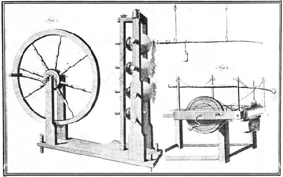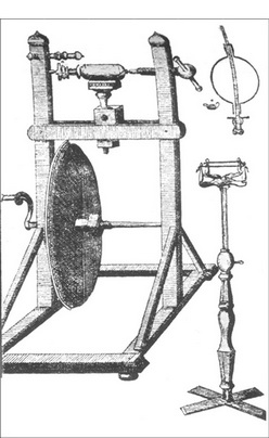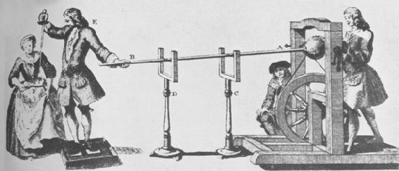 继豪克斯贝工作之后,起电机在十八世纪里有渐缓的进步,尽管它曾极大地促进了对摩擦电现象的深入探究。豪克斯贝去世后大约三十年间,这类机器的潜力被人们忽视,产生电荷的方法一直是用沾有白垩粉末或其他类似物质的小块毛皮摩擦玻璃棒。设计和使用起电机的传统是1743年由莱比锡的C.A.豪森继往开来的。在他那年的著作《电学史上新进展》(Novi Profectus in Historia Electricitatis)中他描述了一种这样的机器。这种机器是一个玻璃球,借助绕在一个带有摇手柄的大轮上的一根线带快速转动它。在豪森装置的示意图中,一个男孩正被丝绳悬吊着,他的双脚触着旋转的玻璃球,因此他既作为一个摩擦者,又可以说是可由之引发火花的原导体(图96)。其后不久,G.M.博塞在他的一首诗《电》(Die Elektricität)(Wittenberg,1744年)以及《电学实验》(Tentamina Electrica)(Wittenberg,1744年)中描述了他自己作的一些改进。博塞宣称,他早在1737年就已用一个玻璃球来起电了。他不用被绝缘的人体,而代之以用丝线悬吊的铁管,用亚麻线使它与玻璃球连通。莱比锡电学家J.H.温克勒制造了一部有数个玻璃球同时工作的起电机。根据他的同乡吉辛的建议,他采用了机械摩擦物,它们是经白垩处理的皮垫,并借助弹簧压住玻璃球(Gedanken von den Eigenschaften,Wirkungen und Ursachen der Elektricität,nebst einer Beschreibung zwo neuer elektrischen